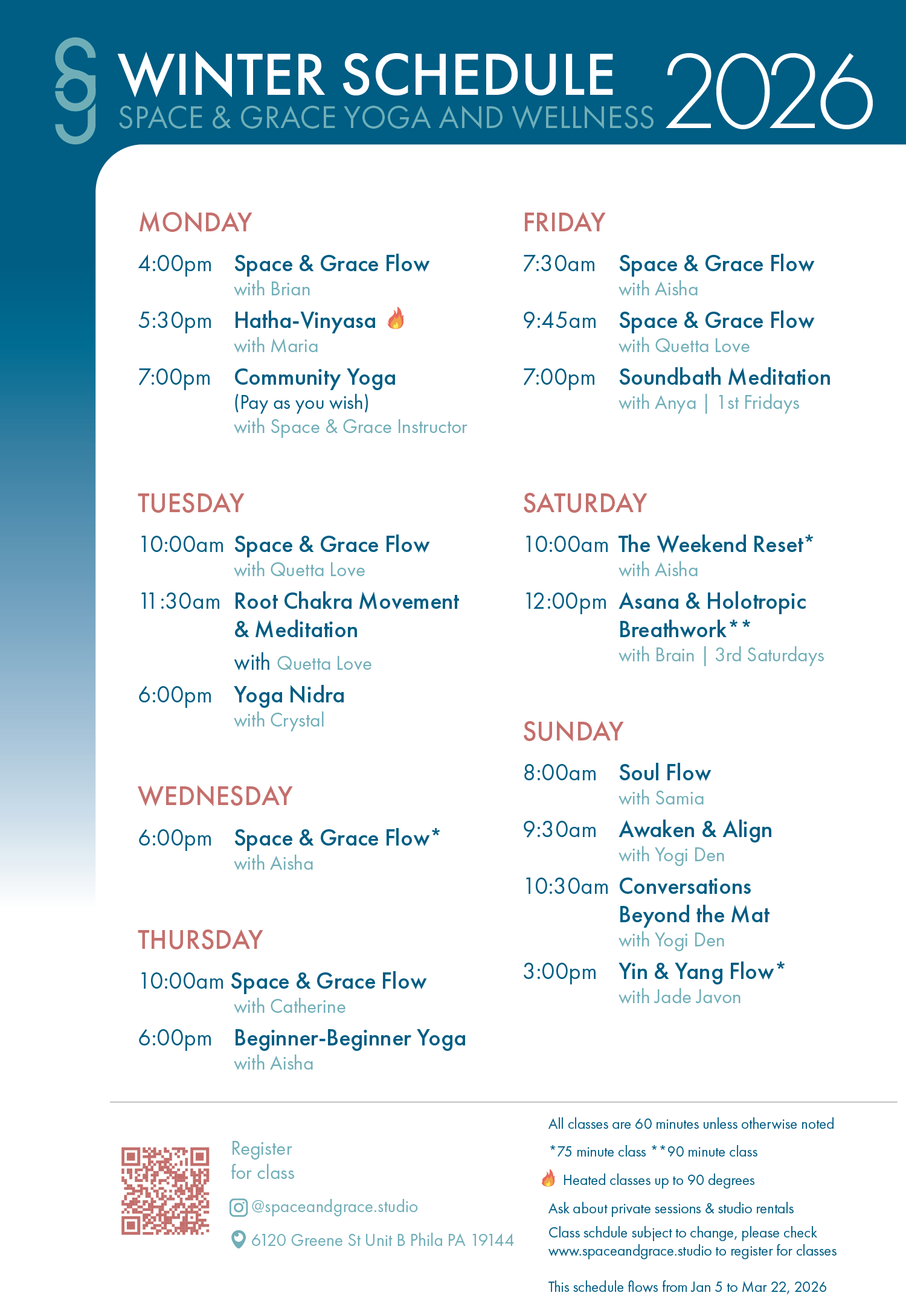 Give yourself space to explore our diverse range of in-person and virtual classes tailored to suit your needs. Join us on the mat!